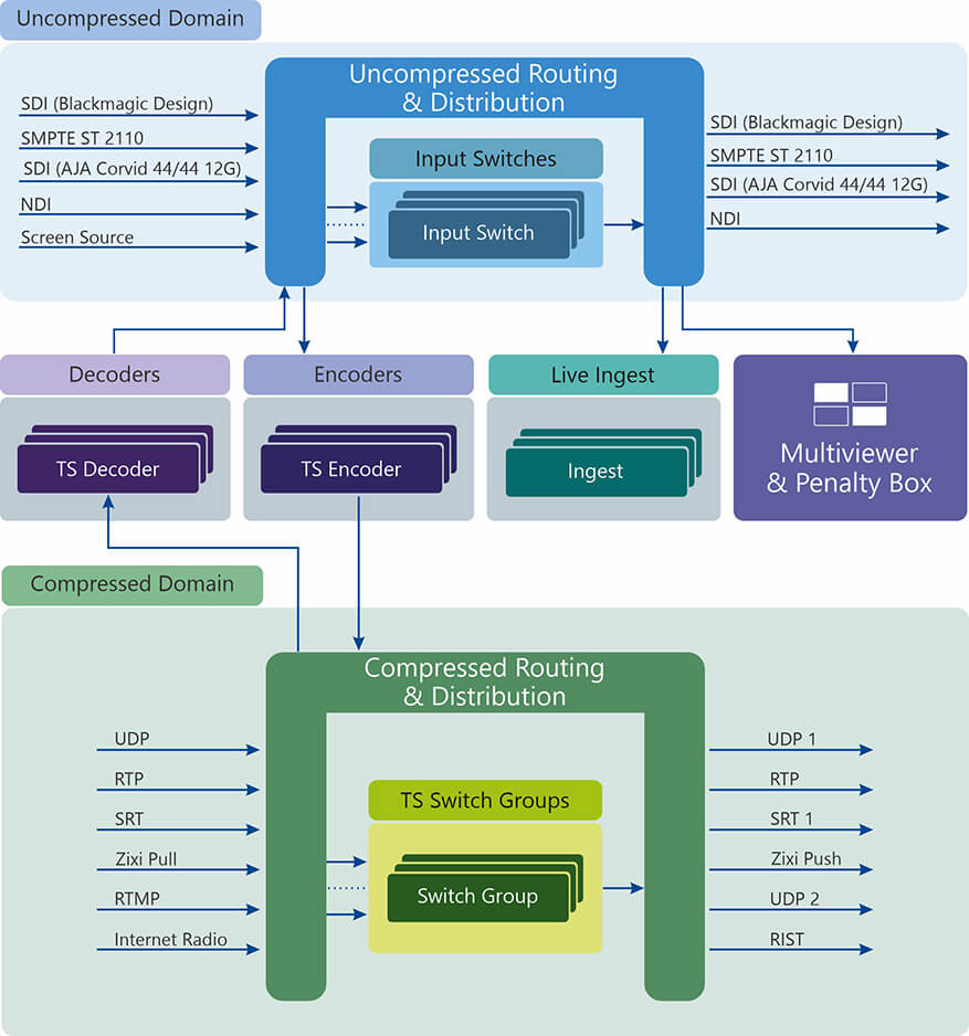 All uncompressed outputs and the encoder allow frame-rate, Up/Down and Cross conversion as well as aspect ratio conversion plus generation of black, bars and freeze on the output when there is no signal. Video can be delivered with an alpha channel where supported. Every input can be delivered to one or many outputs in the same domain. The IP decoder supports both Multiple and Single Program Transport Streams.
